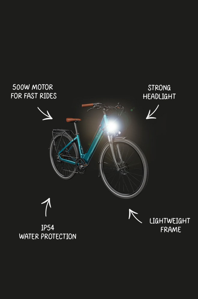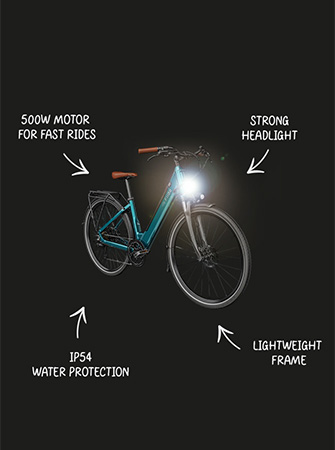La batterie amovible de 499,2 Wh permet un chargement flexible. L'étanchéité IP54 protège contre les éléments quotidiens. Le porte-bagages arrière inclus permet d'ajouter du chargement, et le design du cadre en aluminium permet un montage et un démontage sans effort.