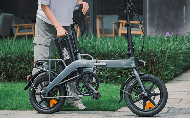 Le Fiido L3 se présente dans un gris élégant avec des pièces noires qui s'harmonisent parfaitement. Les roues de 14 pouces et le cadre pliable sont pratiques. La grande batterie s'insère parfaitement dans le cadre, démontrant la puissance du vélo pour tenir la distance. La selle, le guidon et les freins noirs s'accordent bien avec le cadre gris. Même lorsqu'il est plié pour le voyage, le vélo électrique conserve son look moderne.